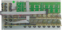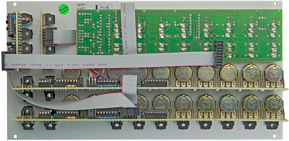 lower row: external inputs for the 8 steps (switched jack sockets), control signals or audio signals may be used as inputs, the knobs of the lower row are working in this case as attenuators