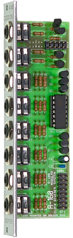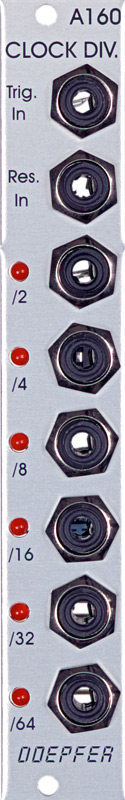 module a-160 is a frequency divider for clock/trigger/gate signals, designed to be a source of lower frequencies, particularly for rhythm uses. the trigger input will take clock signals from, eg., an lfo, midi