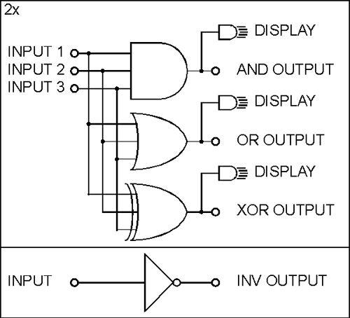 simultaneously at three outputs with led display of the output states. additionally two inverters are avaliable to obtain the inverted functions nand, nor and nexor. the sockets of each triple unit are