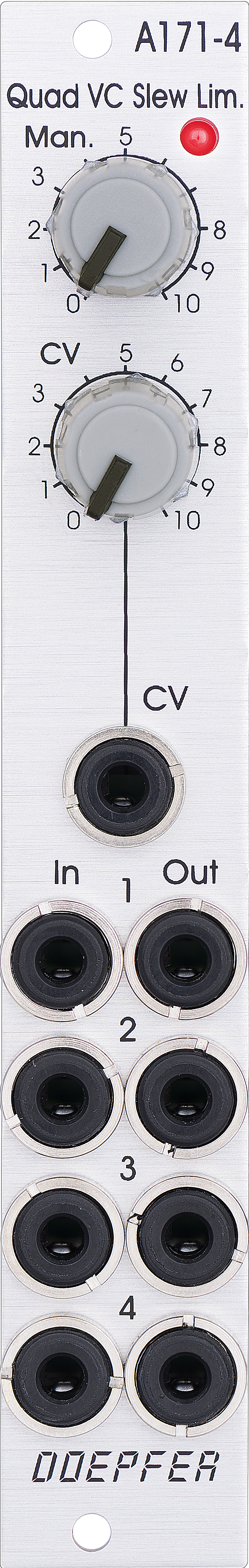 module a-171-4 is a fourfold voltage controlled slew limiter. it's intended purpose is polyphonic portamento but can be used also for other applications where several slew limiters are required. the common slew time can be adjusted manually and in addition