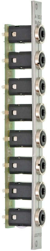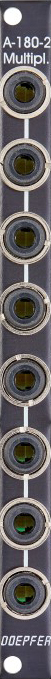 | modules a-180-1 and a-180-2 are simple multi-connectors. they have eight inter-connected sockets, so that you can "multiply" any audio or control signal. from the factory the modules come as two four-foldmultiples. but they can be modified as an eight-fold multiple (solder bridge on the pcb). though these modules are very "primitive" they are required very often in patches (e.g. to distribute a clock signalor a control voltage). within a big a-100 system sufficient multiples should be planned. the function of a-180-1 and a-180-2 is the same. the modules differ only in the front panel width.
