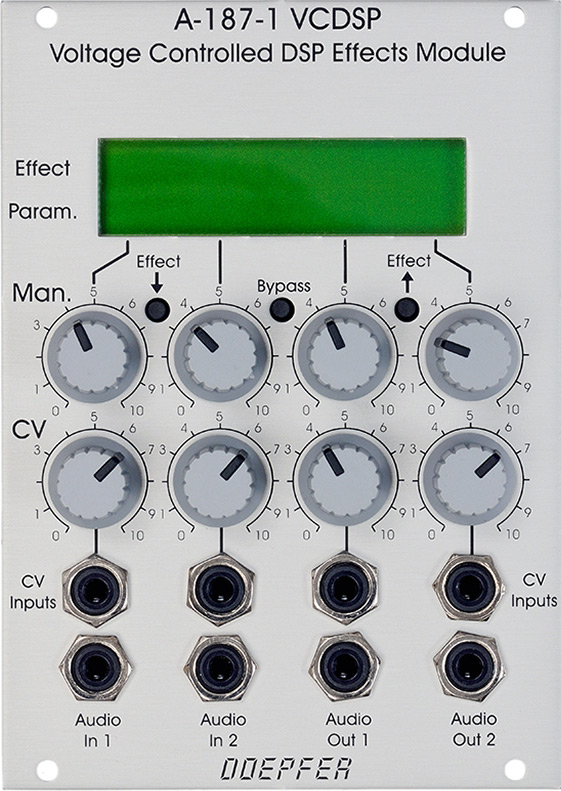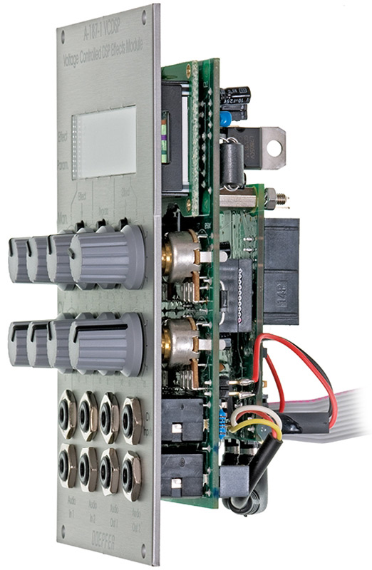 module a-187-1 is a dsp based effects module. four parameters of the selected digital effect are voltage controlled. the main effect (e.g. reverb, delay, pitch-shifter, equalizer) is selected by the two small