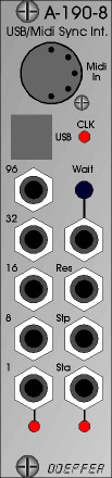 module a-190-8 is a midi/usb to sync interface. the main application of the module is the control of clocked a-100 modules like sequencers (a-155), sequencer controllers (a-154), trigger divider (a-160 or