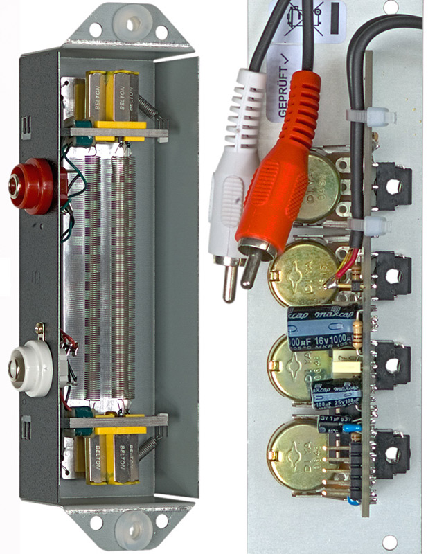 the spring reverb system is connected to the a-199 module via 2 cables with rca phono connectors. as the reverb system is very sensitive to magnetic fields it has to be placed in a big distance from the