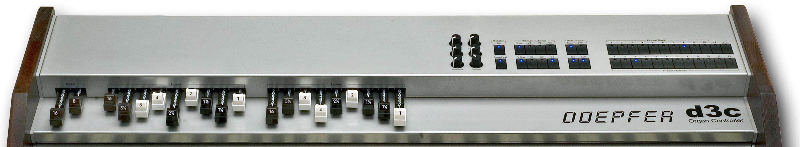 the d3c contains all elements required to control an typical organ emulation. these controls are available: 9 drawbars for upper manual, 9 drawbars for lower manual, 2 drawbars for bass pedal, 6 rotary controls for the parameters of tube and percussion and a lot of additional buttons for vibrato, chorus, key click, rotary speakers and so on. even the 10 + 12 program selection buttons of the keyboard unit d3m will be available. this is necessary if the (one or two) d3m are mounted with hidden button sections.