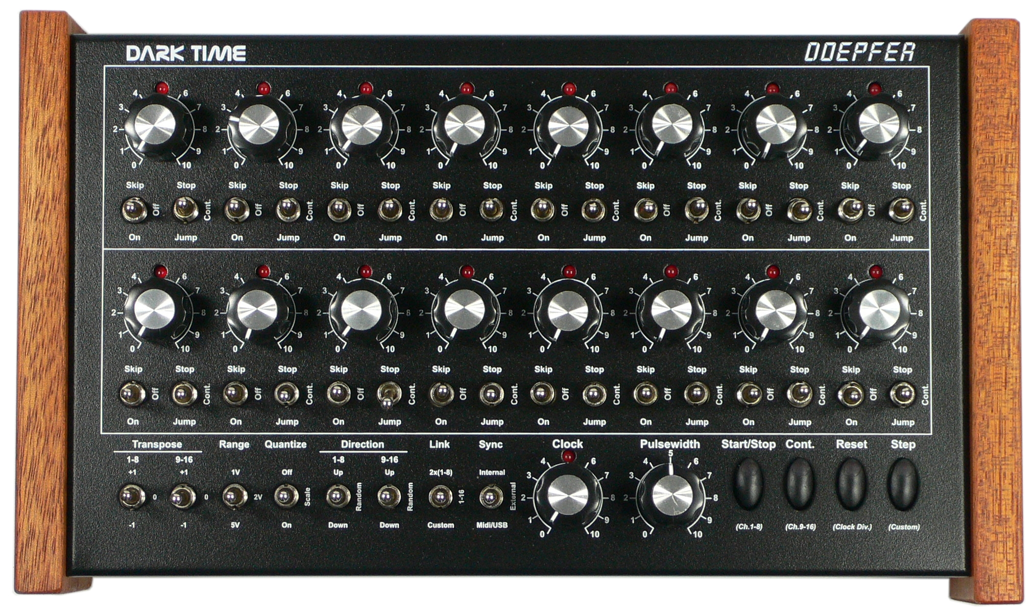 dark time is an analog sequencer that is planned in the first place as an add-on for the dark energy. but it may be used even in combination with other midi, usb or cv/gate equipment too. as the unit is still
