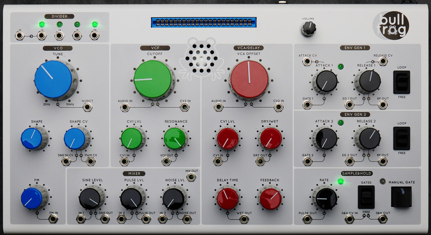 generators and sample & hold. the bullfrog will not make the sound on its own unless it is patched - using eurorack patch cables to interconnect the "modules" or by inserting voice cards that create internal connections between the "modules" in a specific way and
