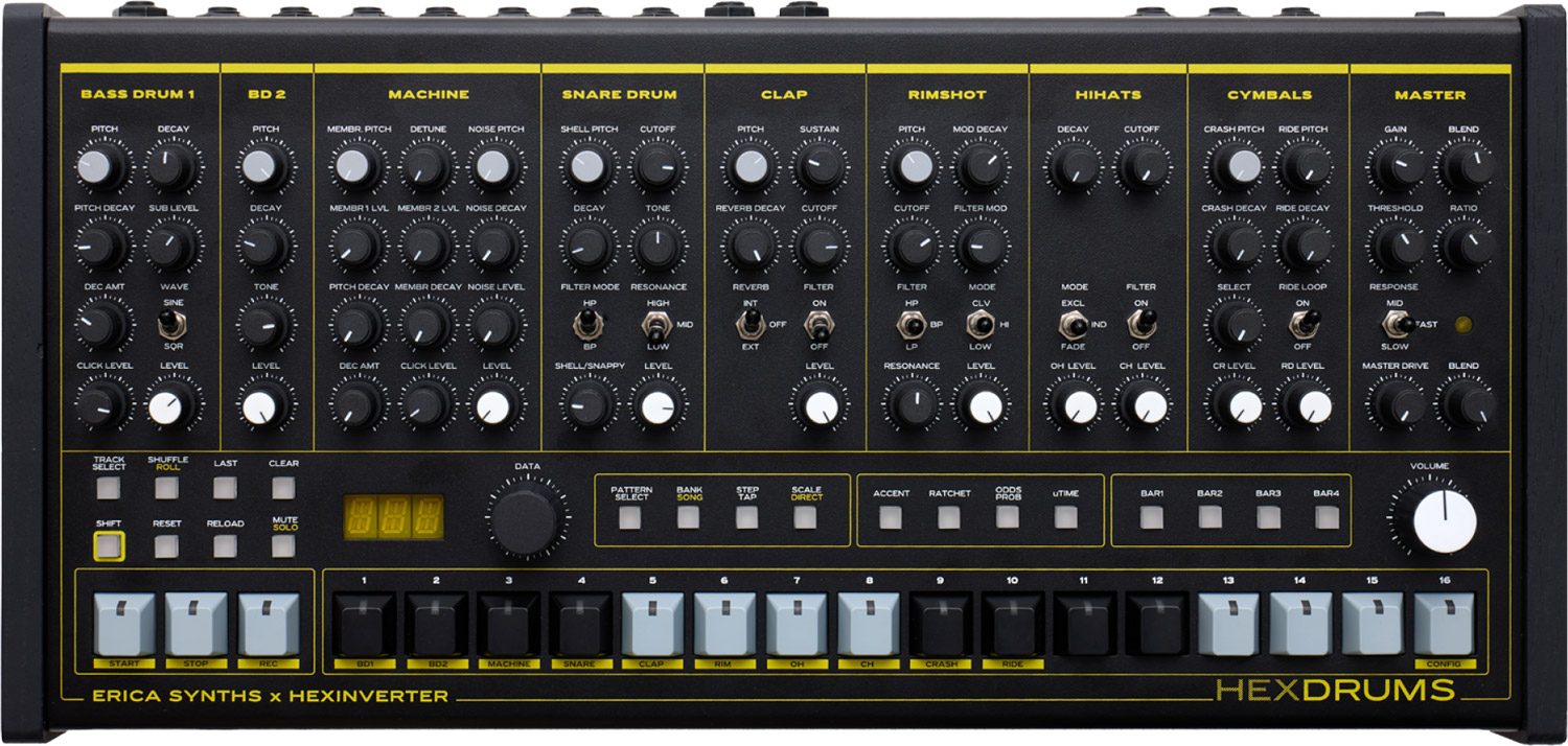the industrial magic of erica synths techno weapons, fused with the dna of hexinverter's mutant circuits is brought to life as the hexdrums - an analog drum machine forged out of deep respect for traditional designs with innovative improvements and the combined spellwork of its makers. combining the range and flexibility of