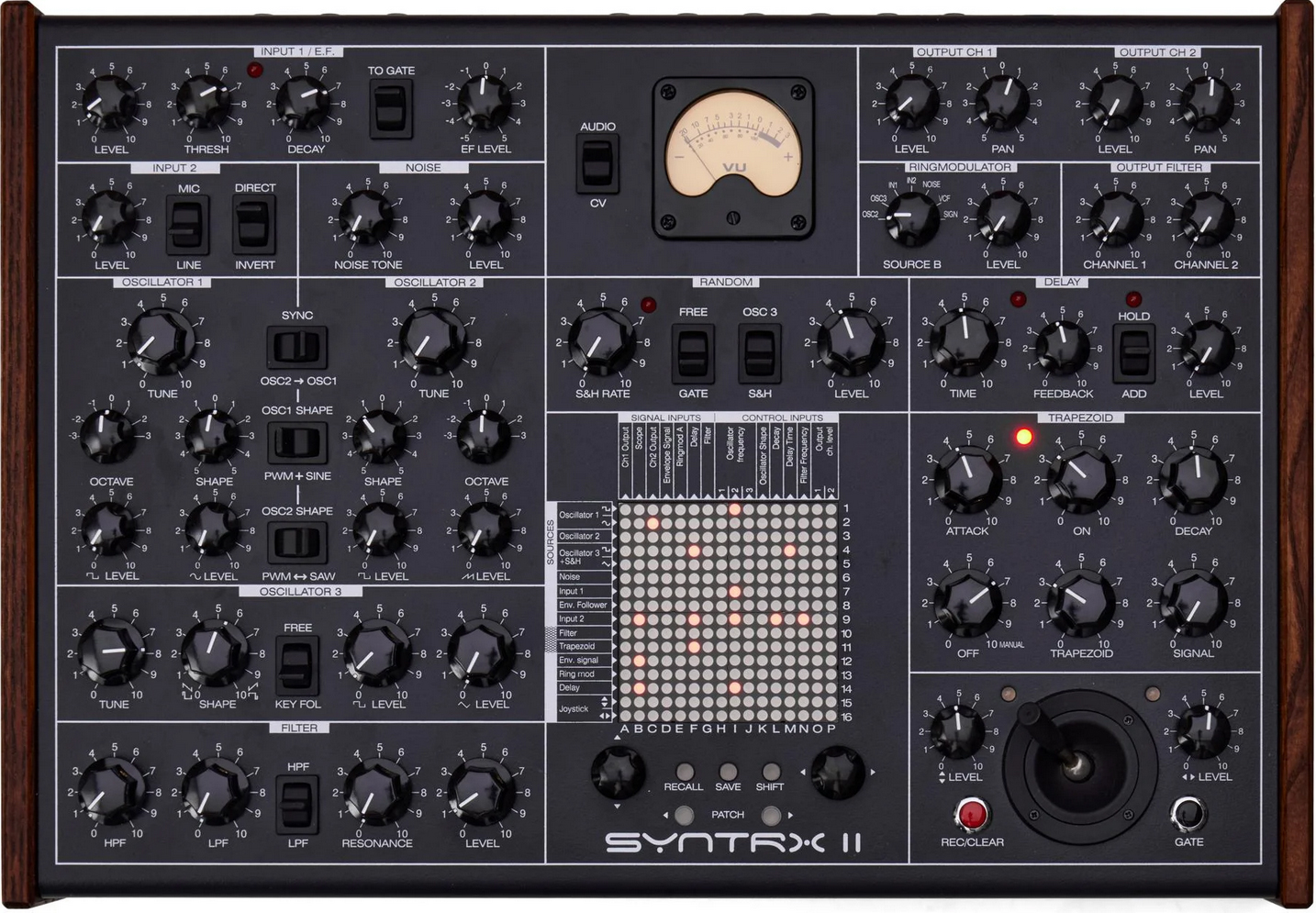 the syntrx ii is the culmination of their analogue sound design circuits - two perfectly stable main oscillators with waveshapers, a modulation oscillator with 1v/oct tracking, a versatile multimode filter, supercharged external instrument inputs with an