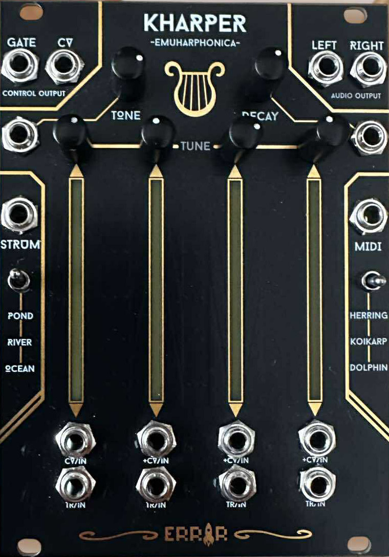 every string is a voice. the strings are built out of two touch strips with an led bar in the middle, showing you what kharper is doing. each string has a knob on top to set the tone and a cv -in below. you can also patch in a gate to pluck the string.