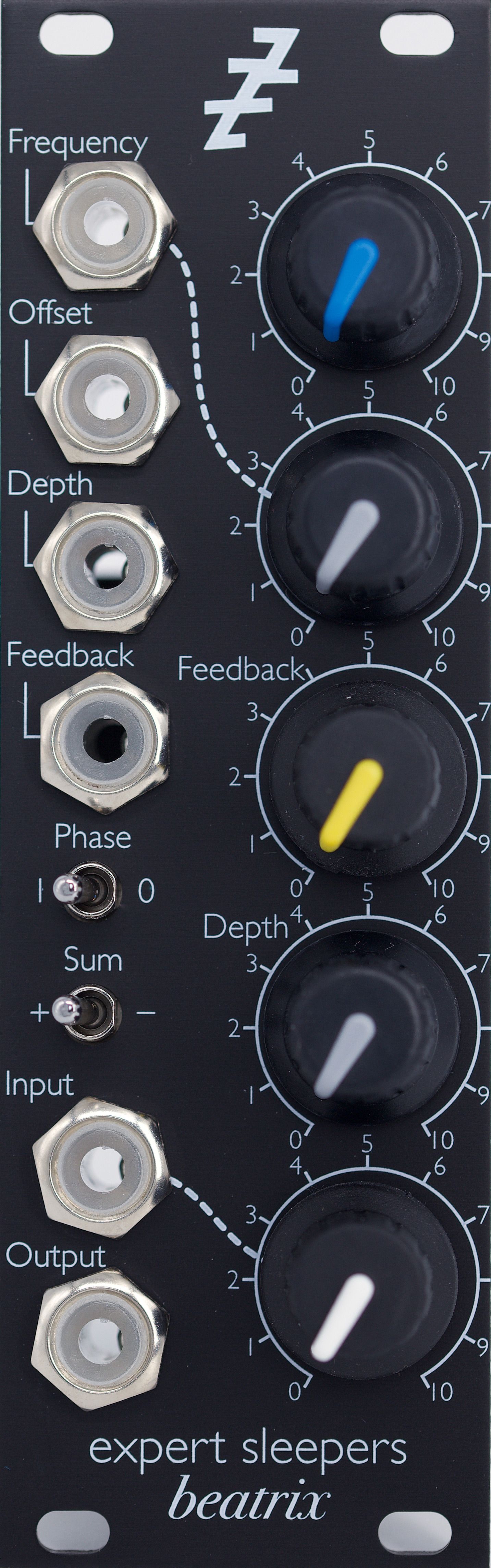 beatrix is a phaser, offering voltage control over notch frequencies, effect depth and feedback (resonance). it also offers an unusual 'offset' control allowing you to sweep the filter notches without sweeping the resonant frequency.