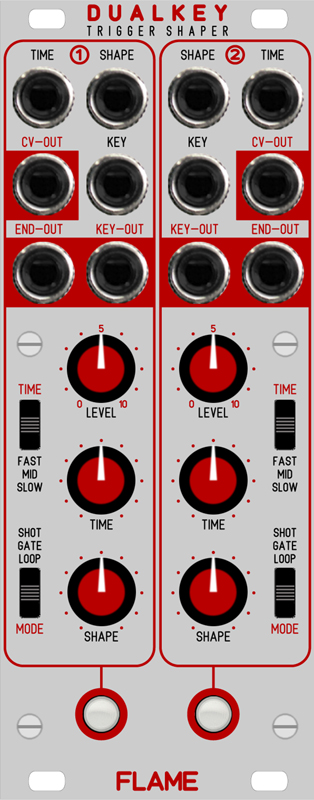 the flame "dualkey" module is a small pingable trigger envelope module, designed for small mobile euro racks. there are two channels with following functions: