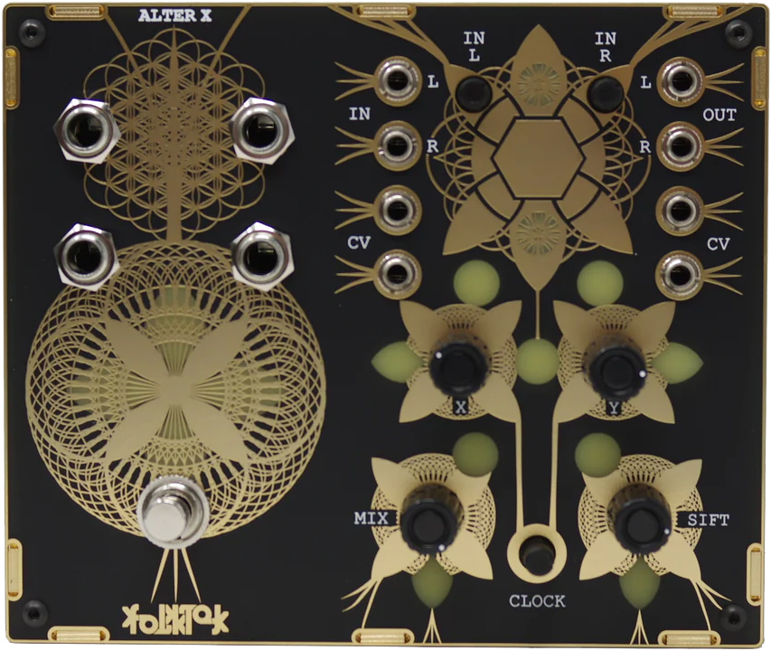 x and y control various rates, feedback and time over the different effects (note that some of the images shows a prototype which says "rate" under two of the pots. the faceplate has been changed to "x" and "y").