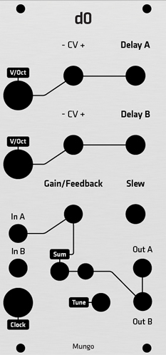 alternate panel for the d0 by mungo. specifications: width: 12hp thickness: 0.063" (1.6mm) material: anodized aluminum graphics: metalphoto process
