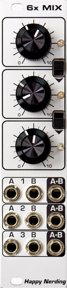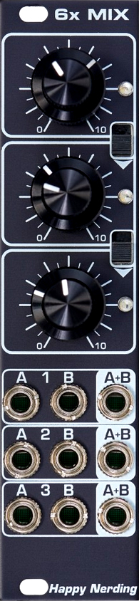 6xmix is a six channel audio (ac coupled) mixer, channels arranged in three groups with separate outputs having led indicators. each group can be switched to mix with the subsequent group, allowing for