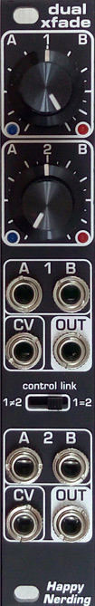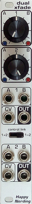 dual xfade is a compact voltage controlled crossfader suitable for both audio and cvs. smaller knobs set manual crossfade between a<>b, and bigger knobs are cv attenuverters. leds show the adjusted positive