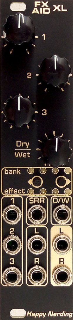 fx aid xl has separate cv modulation inputs for all three effect parameters plus sample rate reducer (srr) input.