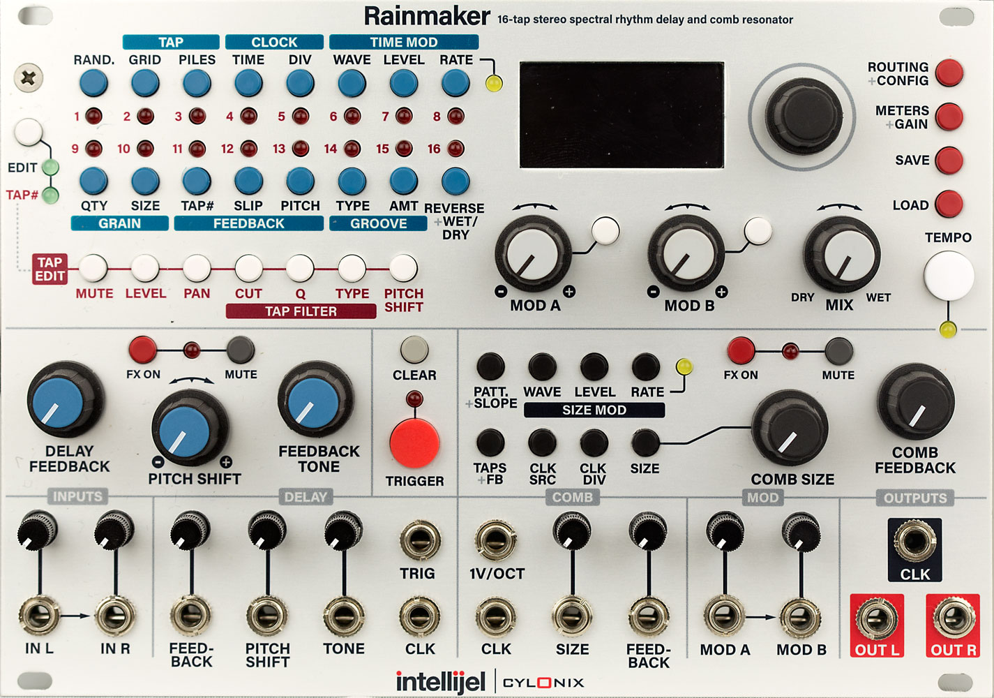 the intellijel/cylonix rainmaker eurorack-format module provides a high-quality (96khz sampling rate with 32-bit internal processing) stereo rhythmic delay and stereo comb resonator effect.