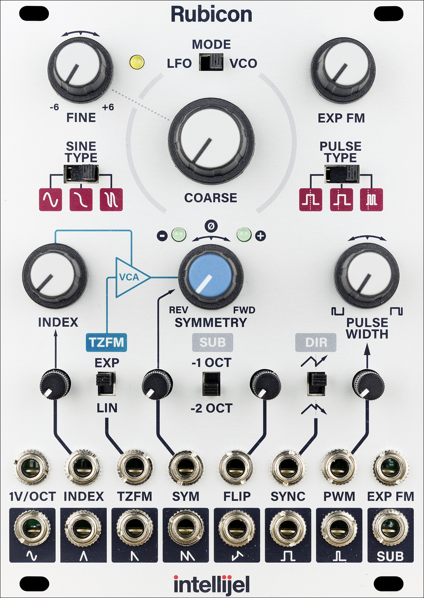 symmetry control (full cw is normal, full ccw gives reversed waveforms, centered the vco is at 0 hz) with vc input