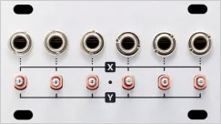 switched mult 1u is an expandable, dual-bus, 6-jack passive signal multiplier, with a 3-position switch to facilitate asymmetrical routings - enabling each jack to be a mult of the x bus; a mult of the y bus; or to be turned off entirely.