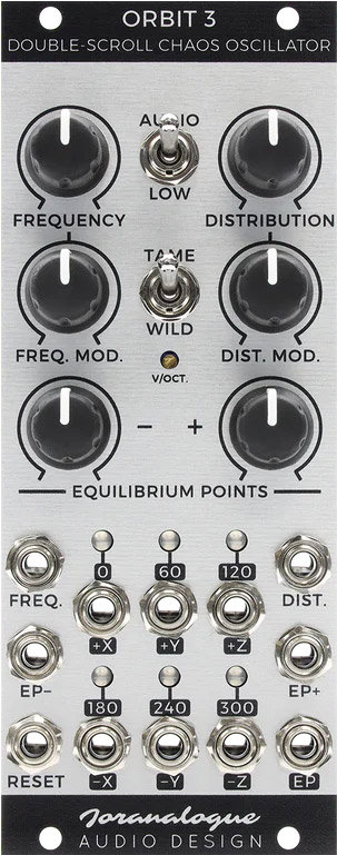 the voltages at each of the module's outputs can be thought to describe the orbit of a particle through 3d space around two equilibrium points. the positions of these points, as well as the distribution of the orbits and rate of movement can all be adjusted under