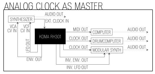 many analog synthesizers as well as modular synthesizers will send analog clocks or have trigger outputs. you can use these signals to sync the rh301 and consequentially the rest of your studio setup. connect