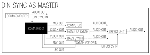 set the master clock source to ext and connect a midi cable from your midi host to the din/midi input on the backpanel. the rh301 now acts as your clock distribution center. you can connect din sync devices