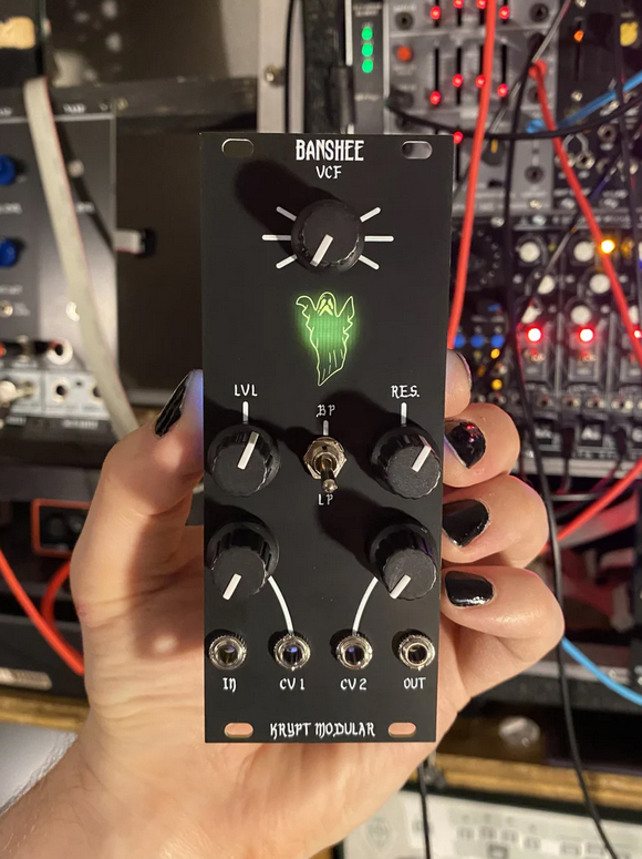 the "banshee" is a 10hp soviet-style vcf with some spooky character! it's quite a crazy-sounding vcf with tons of fluttery, howling resonance and growling lows. crank the resonance and you'll see it's true to its name, the "banshee."