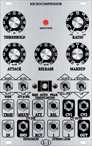 adjustable by potentiometers threshold, ratio, attack, release, makeup gain.
