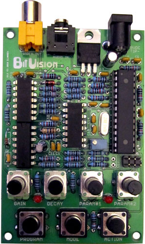 bitvision is a compact visual synthesizer designed for audiovisualization. it creates a composite video output signal which displays a 32x32 pixel image using the currently selected 16-color palette.