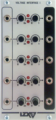 the voltage interface i is a 5-channel precision voltage conditioner which can transform external signals, from 10v control voltages to line level audio, into the 1v signal ranges expected by lzx visionary