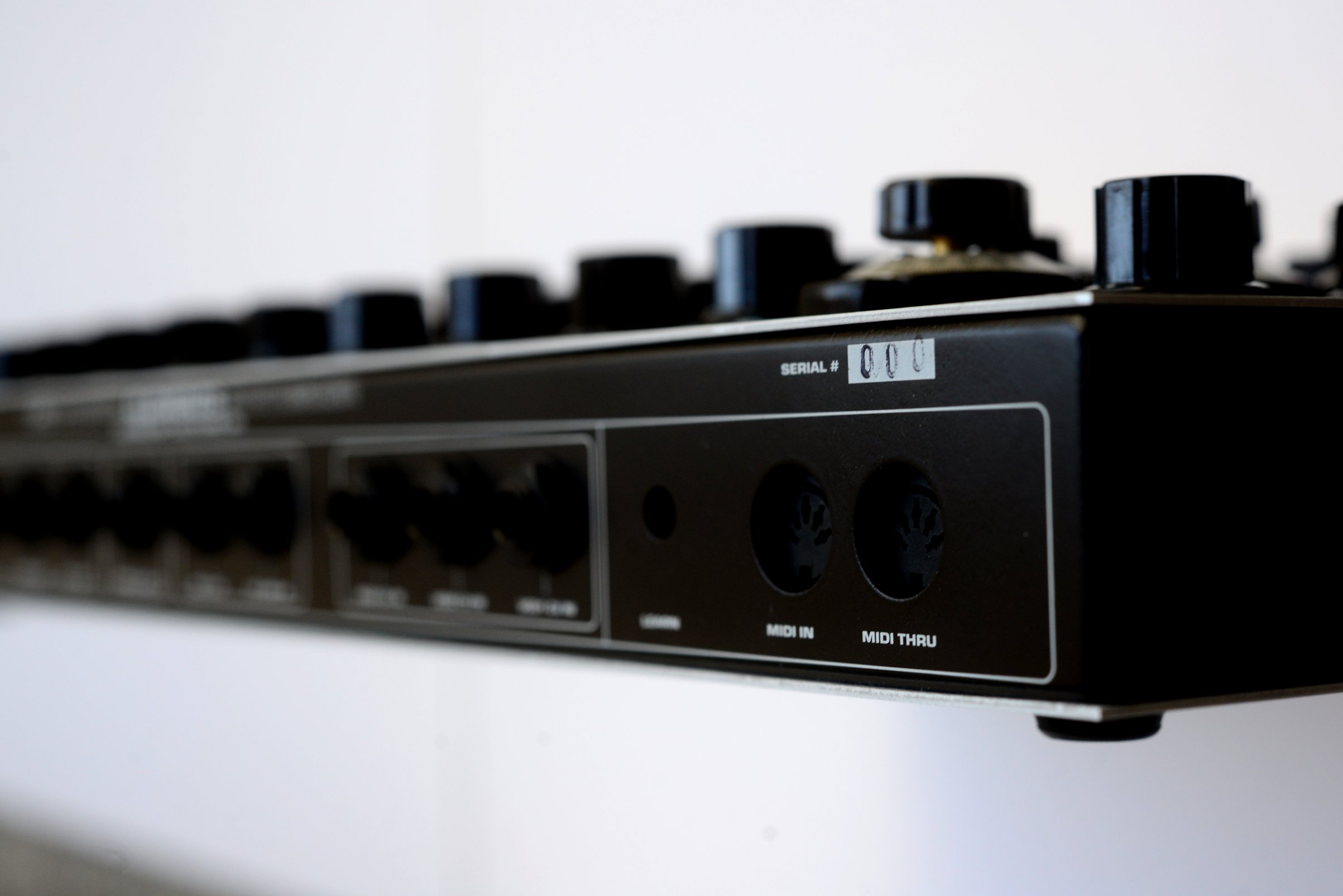 rear section interface: midi in/thru, cv in, gate in, vco1 cv in, vco2 cv in, vco 3 cv in, vcf cv in, external audio in, cv out, gate out, synth out, power in.