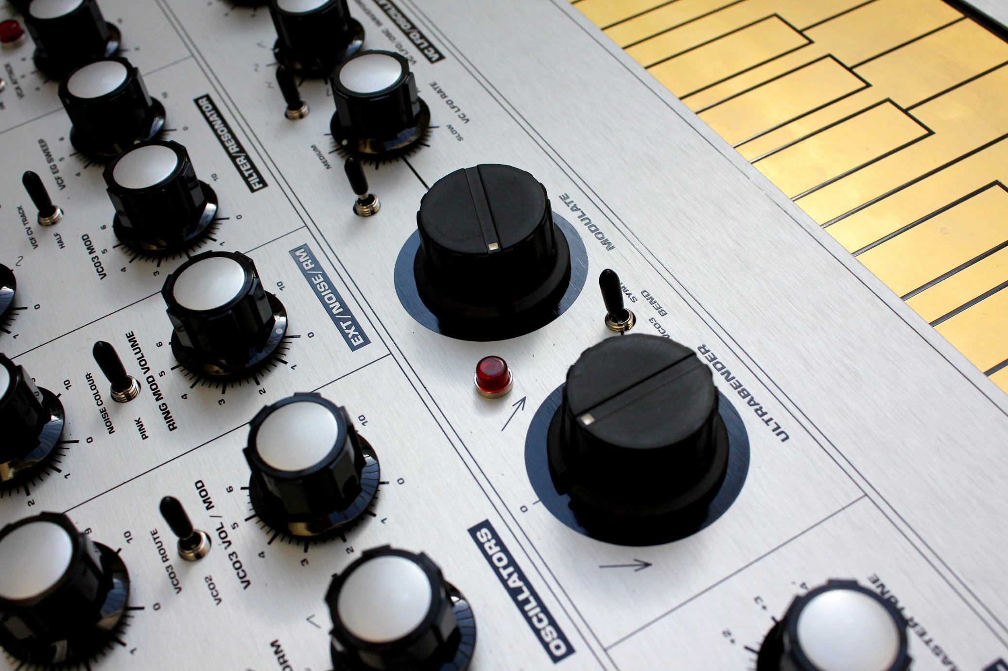 switch. fast ~ slow switch. s&h selector switch: noise source or vco3 source. mod vco3 potentiometer, mod vcf potentiometer, audio to vcf potentiometer, large global modulation potentiometer.