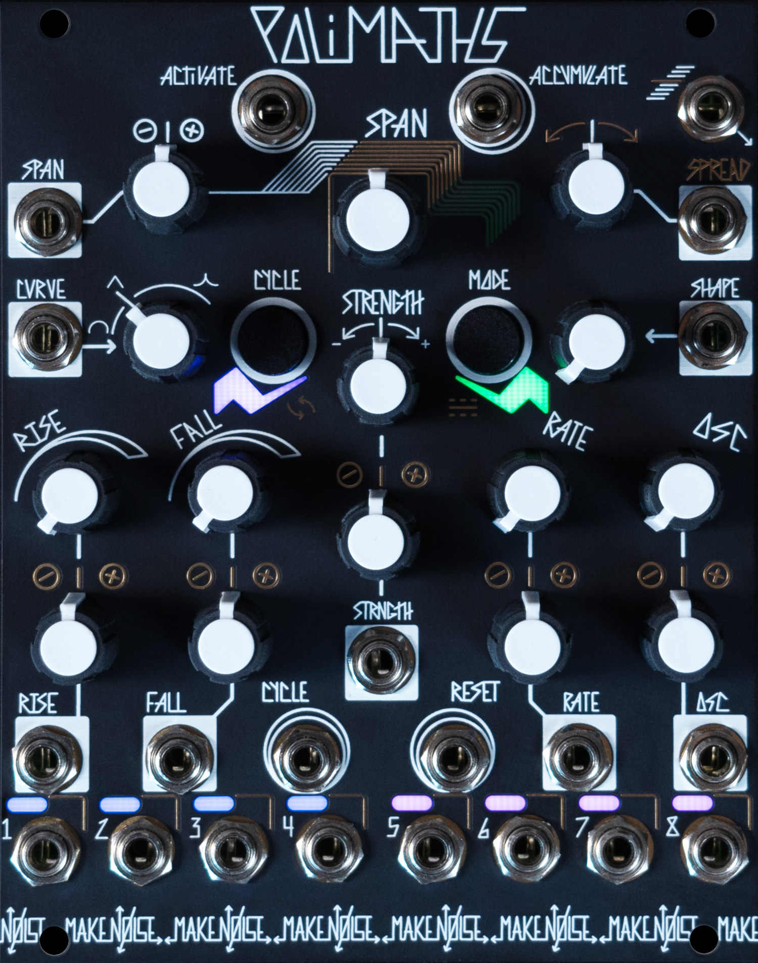 polimaths is an eight-channel cv and audio event generator for the new universal synthesizer system or any eurorack modular synthesizer. it uses a single set of controls to generate complex functions at eight independent channel outputs. polimaths' functions are made up of two components: first, the well-known rise-fall envelope with