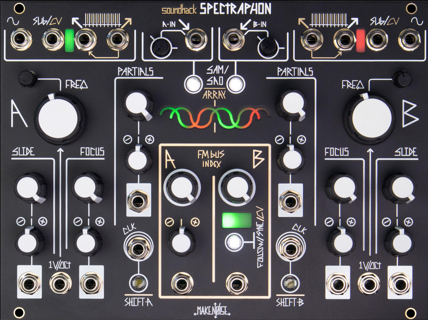 the spectraphon has two nearly identical sides, a and b, which oscillate in one of two ways: spectral amplitude modulation (sam), or spectral array oscillation (sao). in sam, instead of oscillating at all times like an analog vco, sound at the spectraphon's