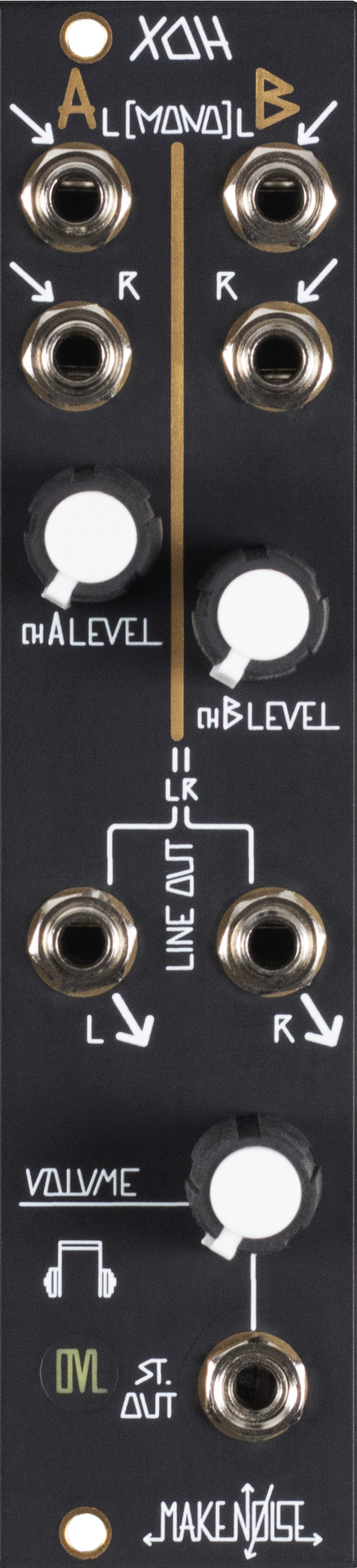 the xoh (mix out headphone) music synthesizer module is a stereo mixer, headphone amplifier and output interfacing module for your modular synthesizer. it consists of two stereo input channels with independent