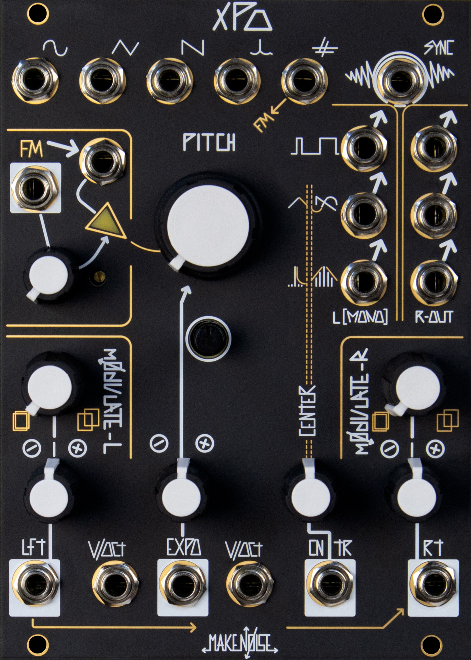 the xpo or stereo prismatic oscillator music synthesizer module is a voltage controlled analog oscillator designed for generating sine waves, triangle waves, sawtooth and spike waves, sub-octaves, stereo