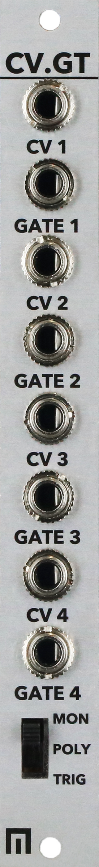 modes : mono (midi channels 1-4 sent separately out cv/gate jacks 1-4), poly (4 notes sent over channel 1 to the 4 cv/gate jacks), drum trigger (notes c1-g1 send gates out of the 8 jacks).