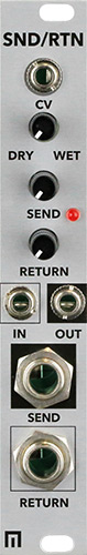 the snd/rtn module includes ¼ jacks for instrument and line level input with cv input to modulate the dry/wet mix as well as manual control over send and return levels (and a clip led). marry malekko