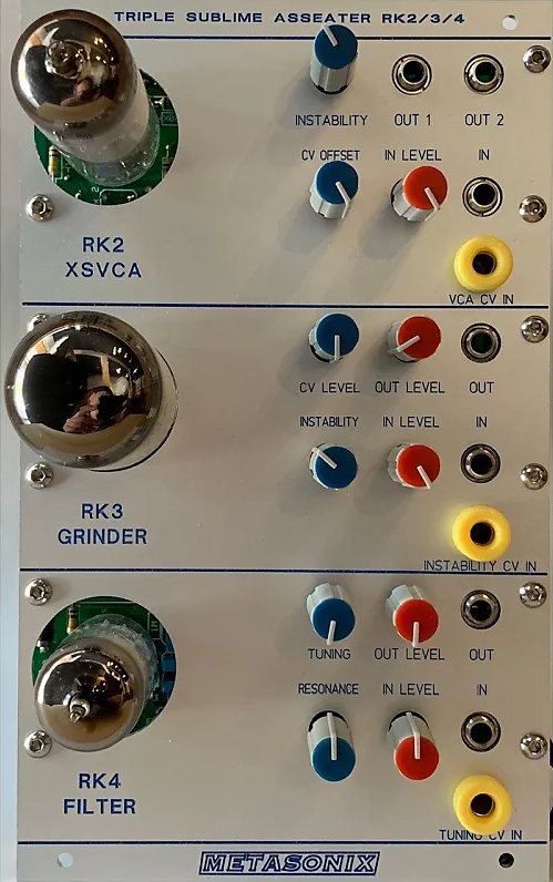 metasonix's first buchla-format module is the "triple sublime asseater", which simply combines the functions of the rk2, rk3 and rk4 in one 4u panel. jacks are chosen and tested to accept switchcraft tini-jax or 3.5mm jacks. it should fit any recent production