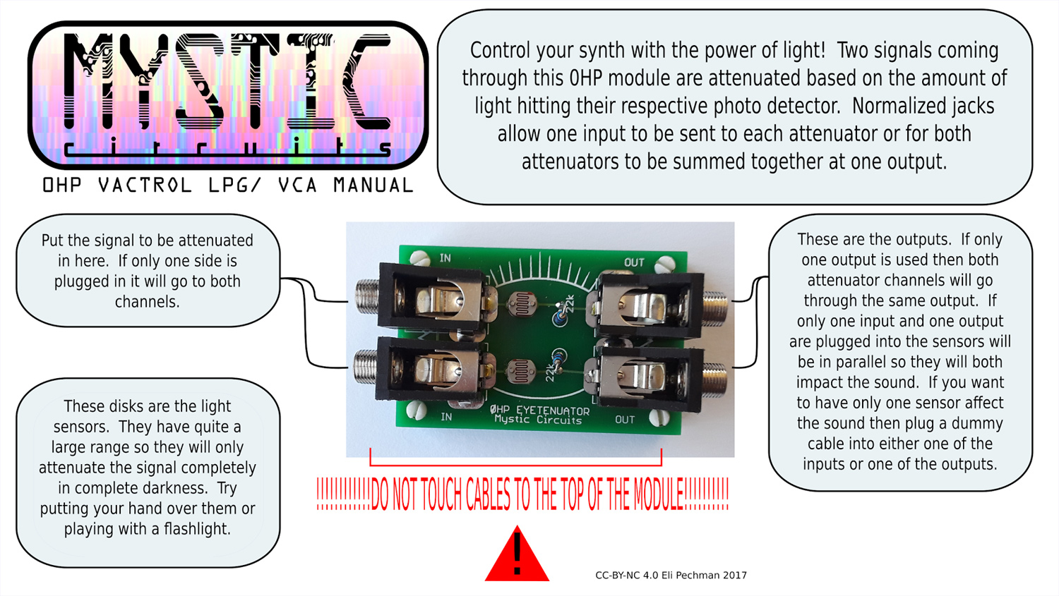 | control your synth with the power of light! two signals coming through this Øhp module are attenuated based on the amount of light hitting their respective photo detector. normalized jacks allow oneinput to be sent to each attenuator or for both attenuators to be summed together at one output.