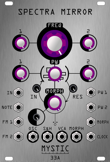 the spectra mirror is a resonant down-sampler tailored for use as a low pass gate. incoming audio can be completely attenuated or passed through unaffected by modulating the sampling frequency, width of thesampling clock or the on board through-zero vca. each control voltage input can be attenuverted, allowing the user to sculpt response to cv. the spectra mirror is also capable of an effect called "high-passsampling," which attenuates signals below the sampling frequency.