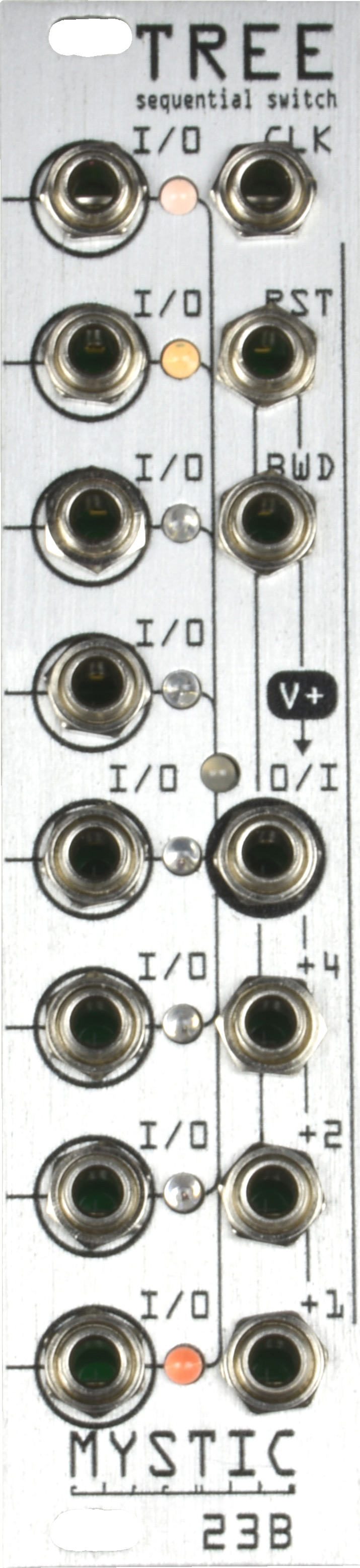 sequential switch with control over the direction of the sequence, whereas the "shift" inputs temporarily shift the current position of the sequence. featuringbidirectional inputs and outputs, tree can also be used as a gate sequencer since the common node is normalled to a high voltage. the turing machine expansion port in the back allows for future expansion oftree's capabilities, including the ability to be used as a note sequencer.