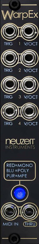 but warpex can also be used to control the voices individually via gate + cv, for example from a multi-track sequencer. hybrid setups are also possible, where midi notes and control voltages are added and e.g. pitch offsets can be given via control