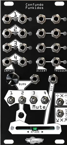 confundo funkidos is a rhythm crossfader and mute utility. patch two pairs of rhythms to the left and right inputs, then use the cv-controllable crossfader and three curve algorithms to fade between them and combine them in different ways. each channel has a mute switch which can be used to bring a voice in and out of a patch at will.