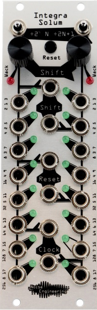 integra solum is a 8hp dual rotating clock divider with 16 trigger outs in two sets of eight. the two sides can be clocked or reset independently or a single input and/or reset normals to both sides. is
