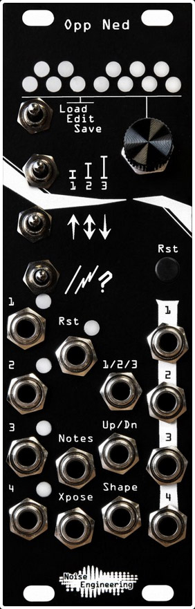 opp ned is a four-channel arpeggiator designed for creating patterns that can be modified with cv. opp ned ships with 12 of our favorite arps, including tetrads, major, pentatonic major, minor third, and pentatonic minor, but you can edit and save custom