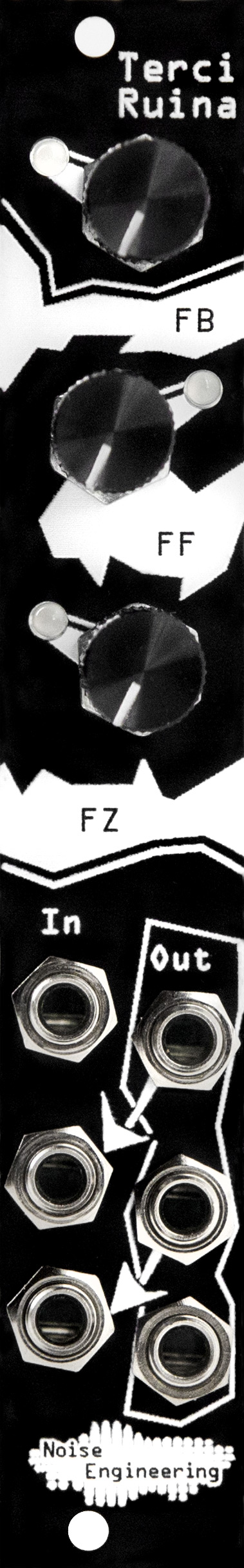 terci ruina combines three classic distortions in 4 hp. distortions are reinterpreted in classic ne style and routed through each other for complete sonic annihilation of any sound. patch in and out anywhere
