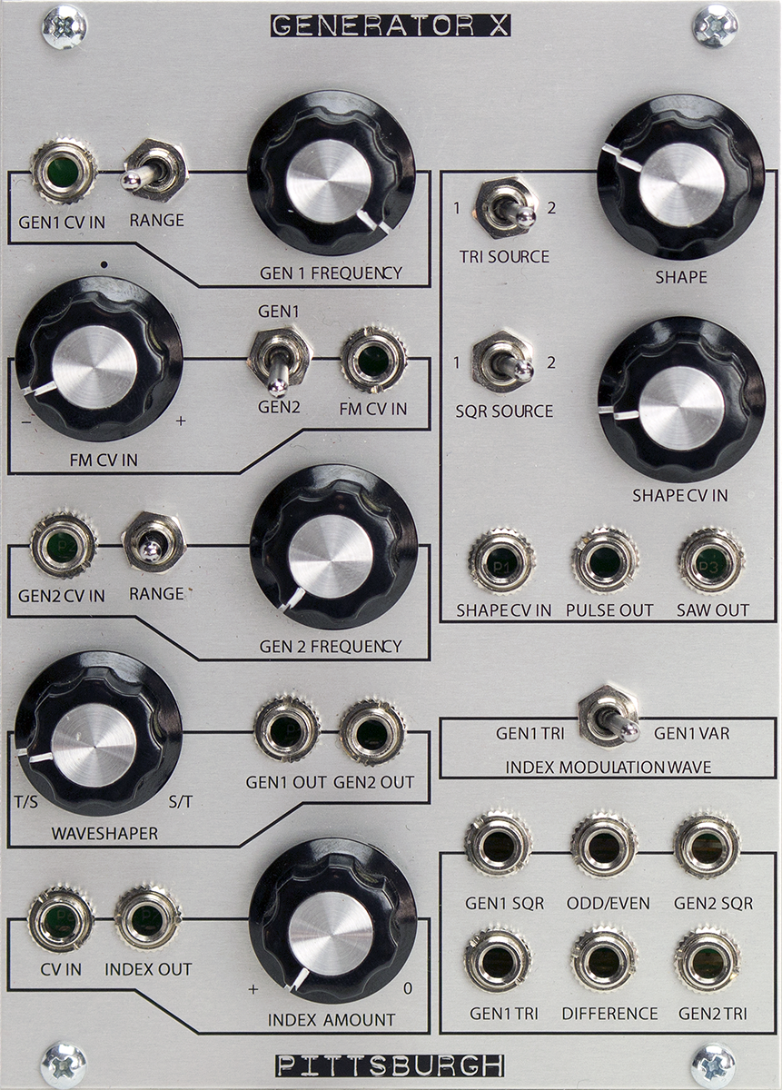 the generatorx combines the generator's dual oscillator, built around two triangle core, wide range, periodic waveform generators, with the genxpander's standard waveform outputs, internal fm waveform selection