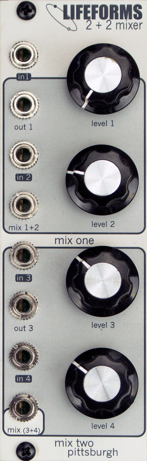 the lifeforms 2+2 mixer is a low noise, ambidextrous four channel mixer for both audio and cv signals. the signal path is extremely versatile allowing it to function in five different configurations.
